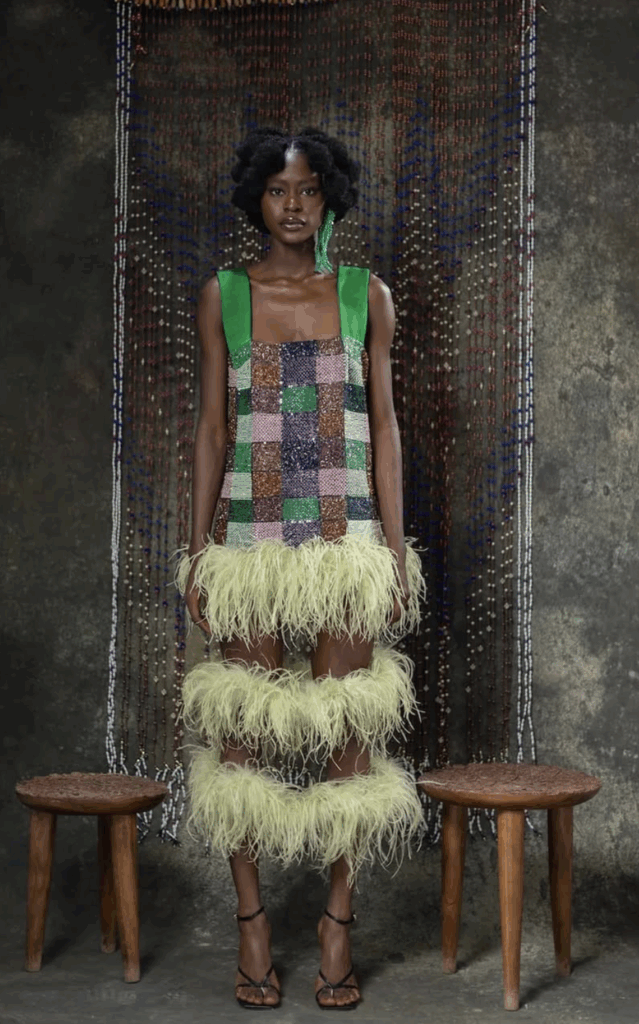 Her signature embellished Ankara was there, of course: dresses heavy with sequined circular motifs in emerald, ruby, and gold, the kind of maximalist statement she’s built her reputation on. But there were surprises too. She’d been experimenting with treating Ankara fabric with leather finishes, creating something between textile and hide. Beaded fringe cascaded from caftans in champagne tones, while other pieces mixed bold geometric prints—blue bubbles against brown checks on a single silhouette, the kind of pattern clash that shouldn’t work but does when you trust your eye.