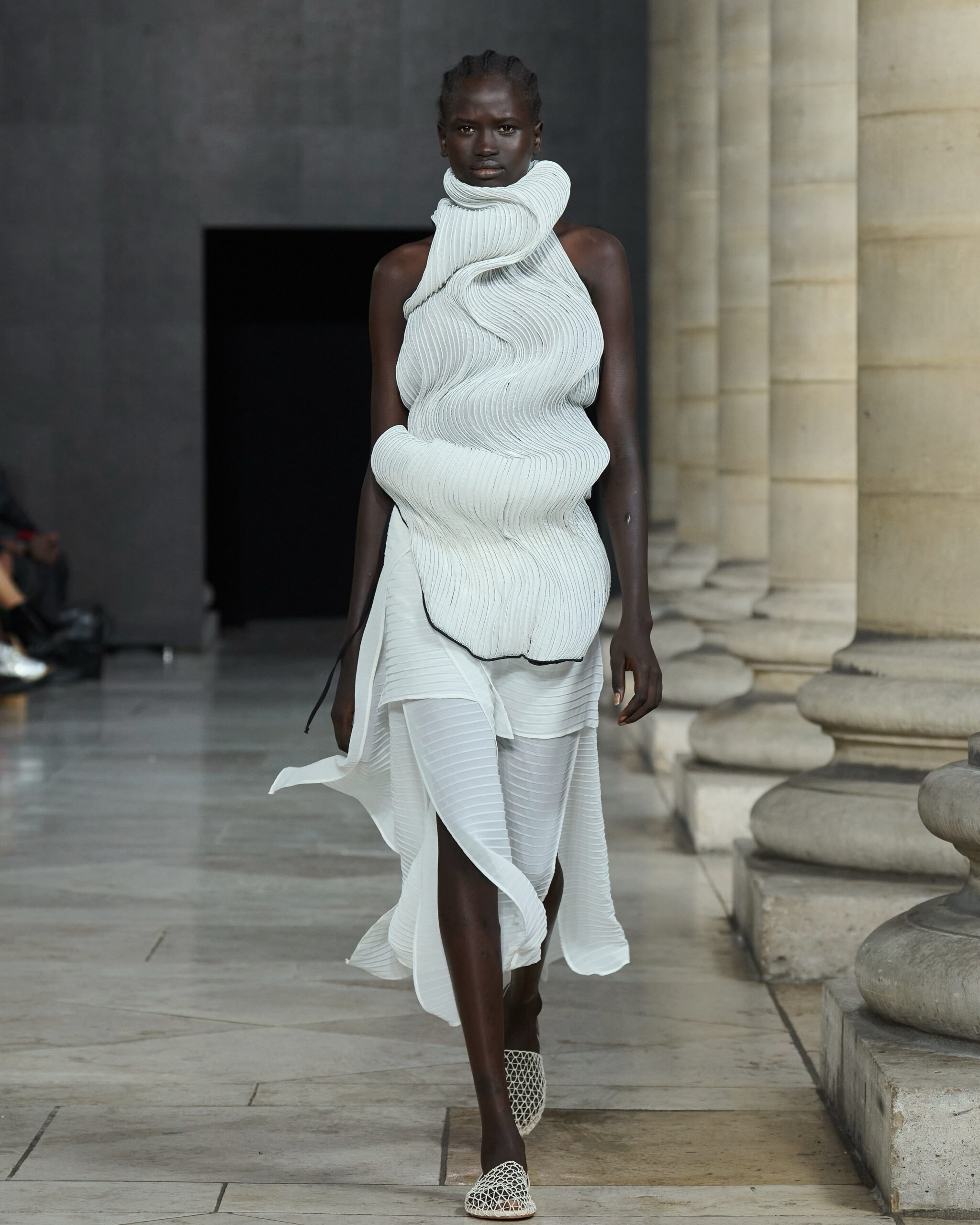 South African designer Shelley Mokoena’s “Hand in Hand” collection leaned heavily into craft. Handwoven fabrics, floor-sweeping silhouettes, and an earthy palette of ochre and stone created a cohesive, textural story.