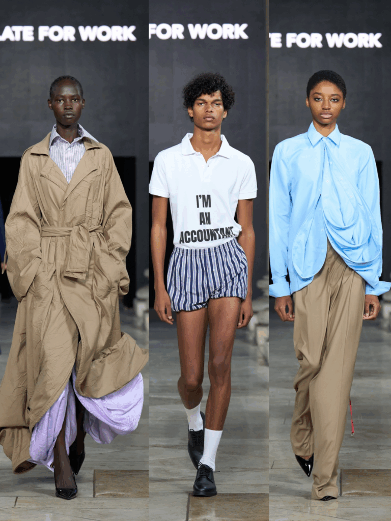Moroccan designer Youssef Drissi took a different approach with “I’m an Accountant,” a collection that deconstructed corporate dressing with obvious humor.