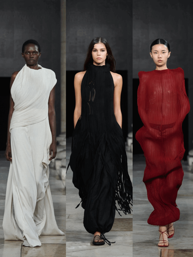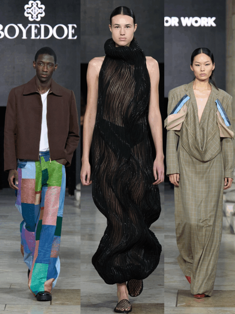 Creative director David Kusi titled his collection “Manifesto Chapter III: Paradise Regained,” drawing loose inspiration from John Milton’s epic poem. But the reference matters less than the execution: flowing robes paired with structured tailoring, a palette of desert browns and gold, and exposed seams that became deliberate design details.