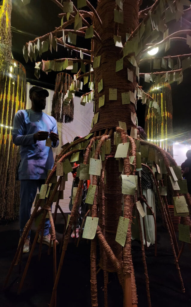 Curated by Fikayo Adebajo and activated by A Third Space, Speaker’s Corner: City of Dreams invited visitors to reflect on how collective imagination might shape the cities of tomorrow. At its heart stood The Mangrove Tree—a sculptural, sustainable installation symbolizing interconnectedness and resilience. Drawing inspiration from the balance of natural ecosystems, the work offered a vision of urban life rooted in collaboration and care. Fabricated by MitiMeth, a social enterprise that transforms invasive water hyacinth into usable materials, the installation brought together artisans who wove hyacinth, willow, and handmade paper into a striking symbol of regeneration.