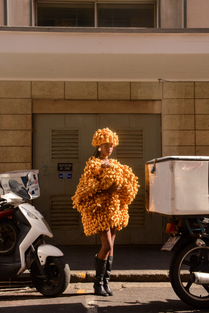 Turning Yarn to Art in The Hustle and Bustle of Capetown.A collaborative work between crochet designer Diana Seboke and photographer Ben Mall telling a visual story of the grit, magic and beauty of Cape Town, South Africa. DIANA-SEBOKE-by-Ben-Mall-6-of-75-1 Credits: Designer @dianaseb0ke Photography @ben.mall Model and styling @sedi22000