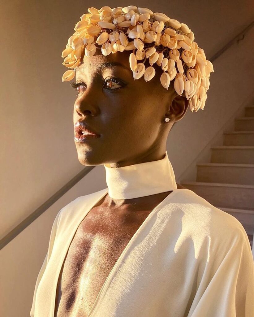 Dion’s work, shown with Acne Studios at Paris Fashion Week and sold globally through Afrikrea and Etsy, is crafted by Ivorian artisans in two to four days, each piece hand-threaded with sustainably sourced shells. Her designs are as much ritual as accessory — gender-neutral, spiritual, and unapologetically African. She is not alone. Melissa Simon-Hartman’s Cowrie Rebellion Belt electrified Black Is King’s “Mood 4 Eva.” Gambian brand Aajiya adorned Gabrielle Union in its Pétaw collection. Lupita Nyong’o and Atlanta artist Fahamu Pecou have each embraced cowries: Pecou’s New World Egungun series sells internationally, blending Yoruba tradition with sharp commentary on Black identity.