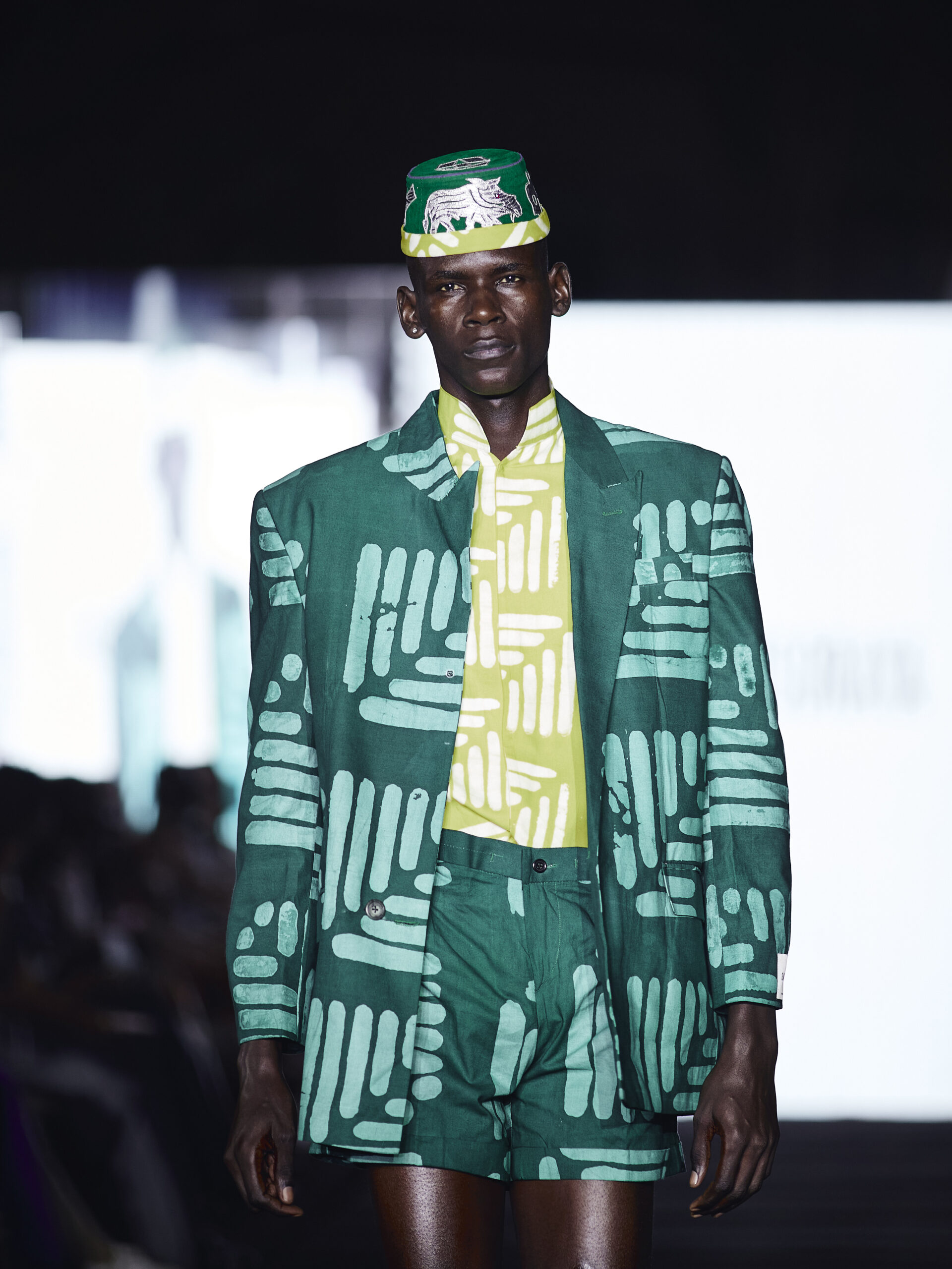 Bakus Oraya presented an homage to the Beninese Amazons. Hand-dyed batik, woven loincloth textiles, and adire techniques anchored a collection that balanced ancestral reference with restrained tailoring. A green resist-dye suit—double-breasted blazer, tailored shorts, matching kufi—captured the approach: traditional technique, modern cut.