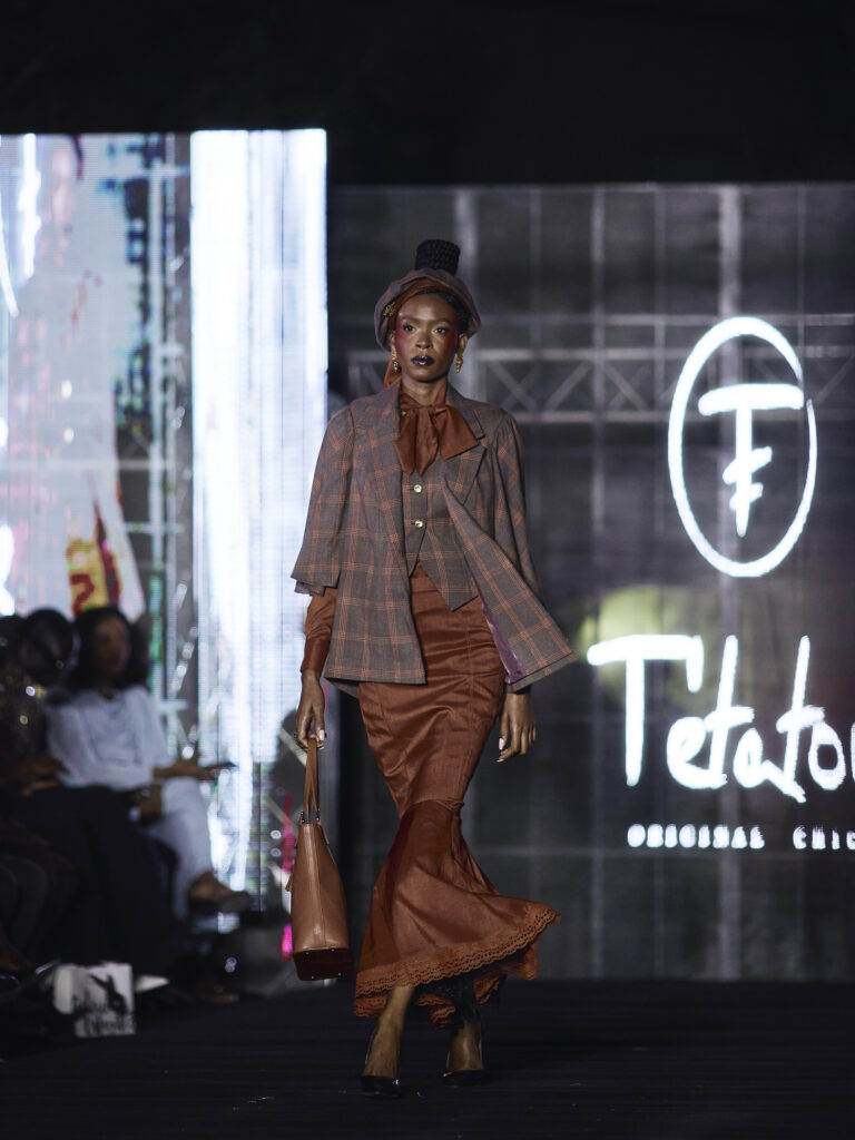 Tailoring set the tone. Ngorbatchev’s AURA collection used Super 100 wool cut with architectural precision—referencing the costume africain while holding European structure. Tetatou layered structured vests over tiered sleeves, cinched with wide belts. Maat showed oversized blazers and sculpted headpieces in a modest wear context.