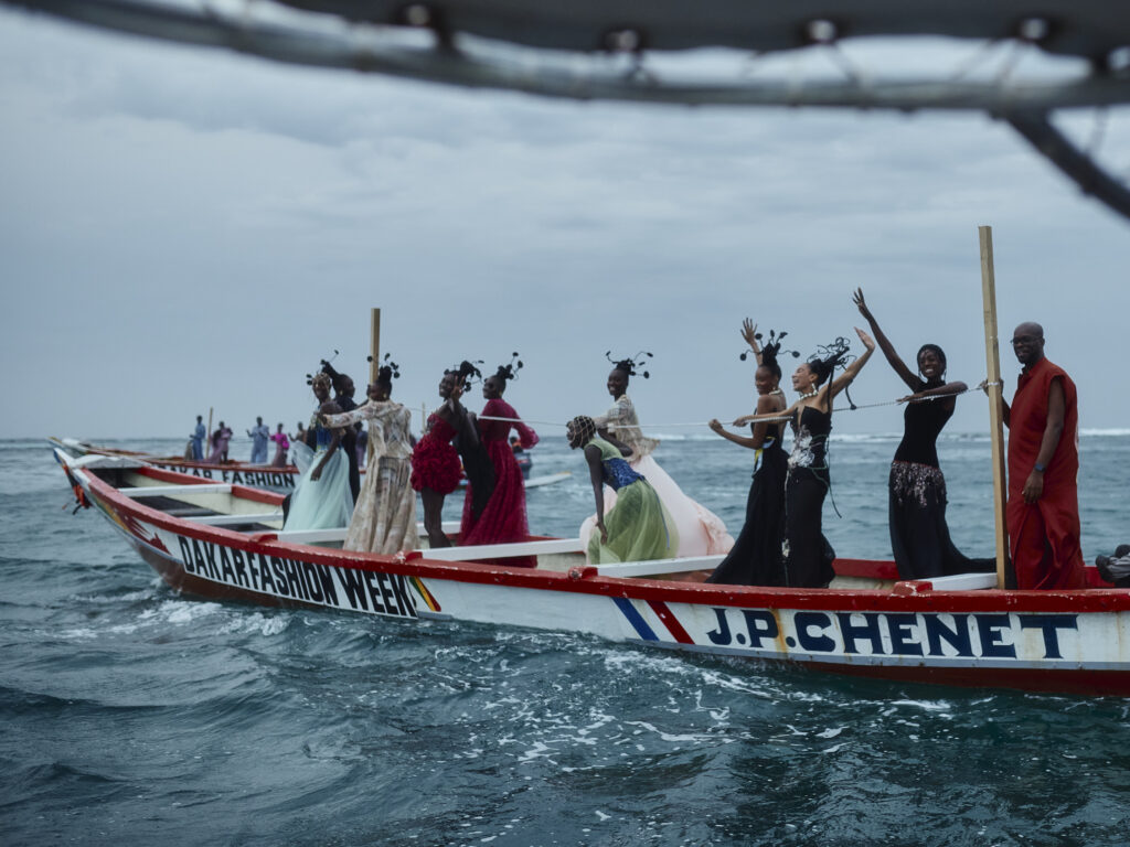 The closing day moved onto traditional pirogues in the Atlantic off Ngor Island. Models stood on the boats gripping rope rails. Wind and tide became part of the presentation. The staging used local infrastructure—fishing boats that line Dakar’s coast daily. It’s a format specific to the place.
