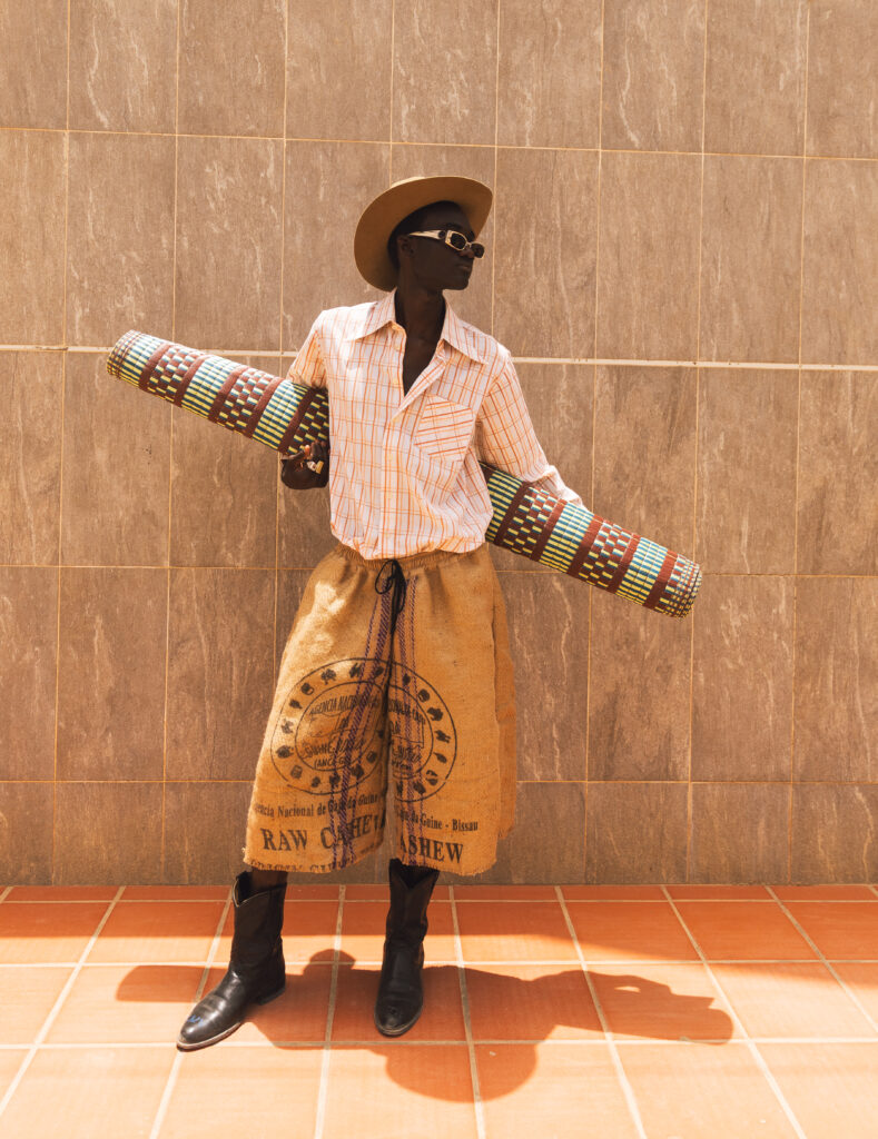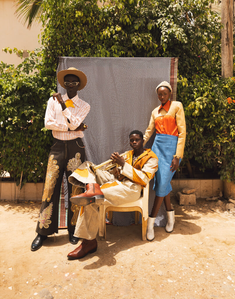 Here, fashion doesn’t whisper. It sings. Each look is styled like a beat: collaged, textured, and built for movement. Baby blue suiting echoes the softness of jazz. Washed-out denim recalls old cassette covers. Rusty orange and fluffy, faded pinks burn like sunsets over Ouakam rooftops. Silk scarves swirl through frames like melodies, while structured jackets bring percussive weight.