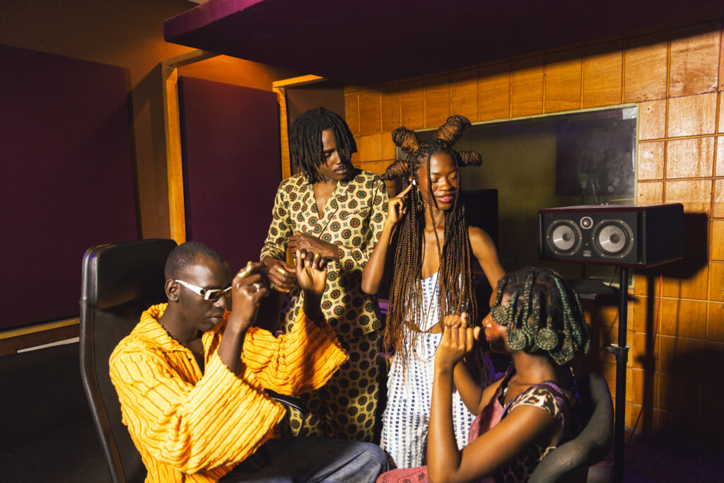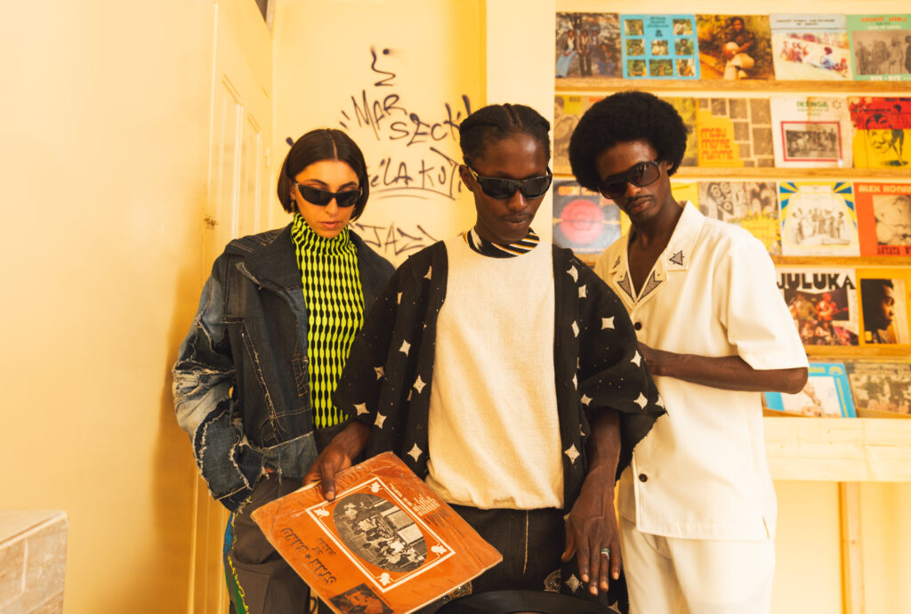 The styling is unapologetically loud. Statement rings stack like chords. Crochet coifs and oversized sunglasses beam like stage lights. Silk scarves swirl like sampled vocals. Accessories by Accessorydels and Fadel Guingue, sourced in local markets, don’t just decorate—they amplify, pushing the energy further.