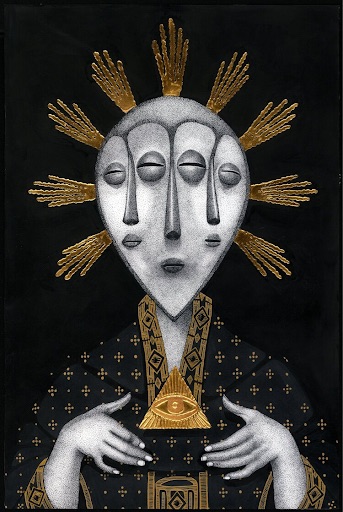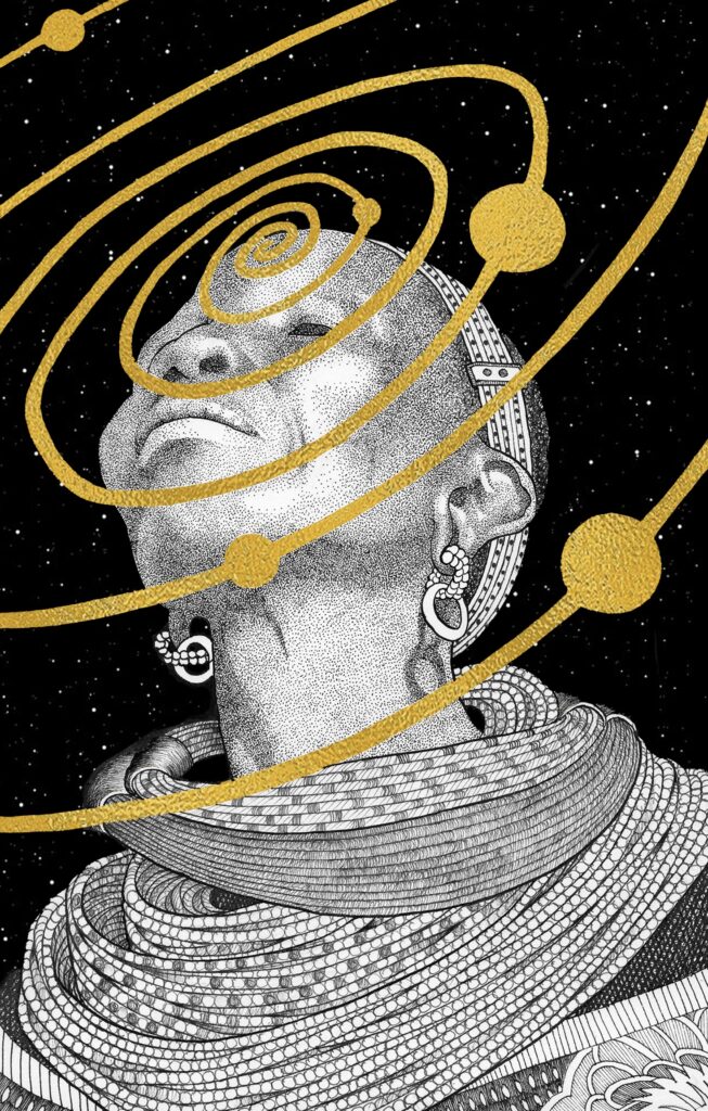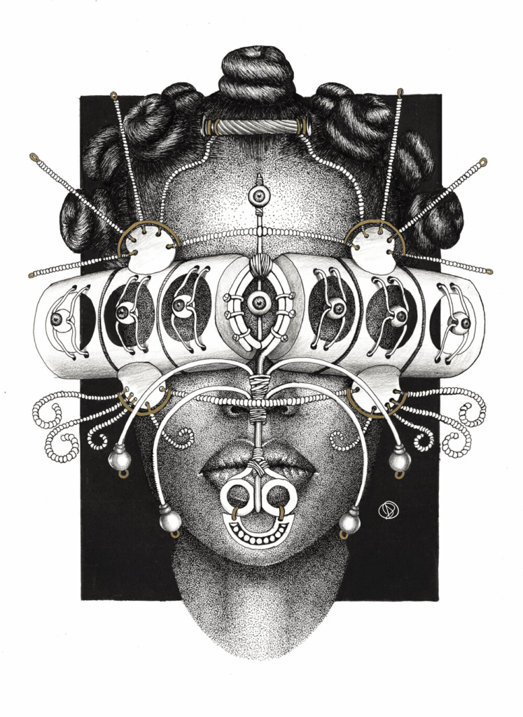 A Nigerian-born, Virginia-based visionary, Oruwari works primarily in pen, ink, and gold leaf. Her intricate, iconographic artworks channel Afro-spiritual cosmology and explore the sacred interconnectedness of the seen and unseen realms. Both her visual and sonic practices are rooted in ritual, functioning as tools of decolonization, cultural preservation, and spiritual reawakening.