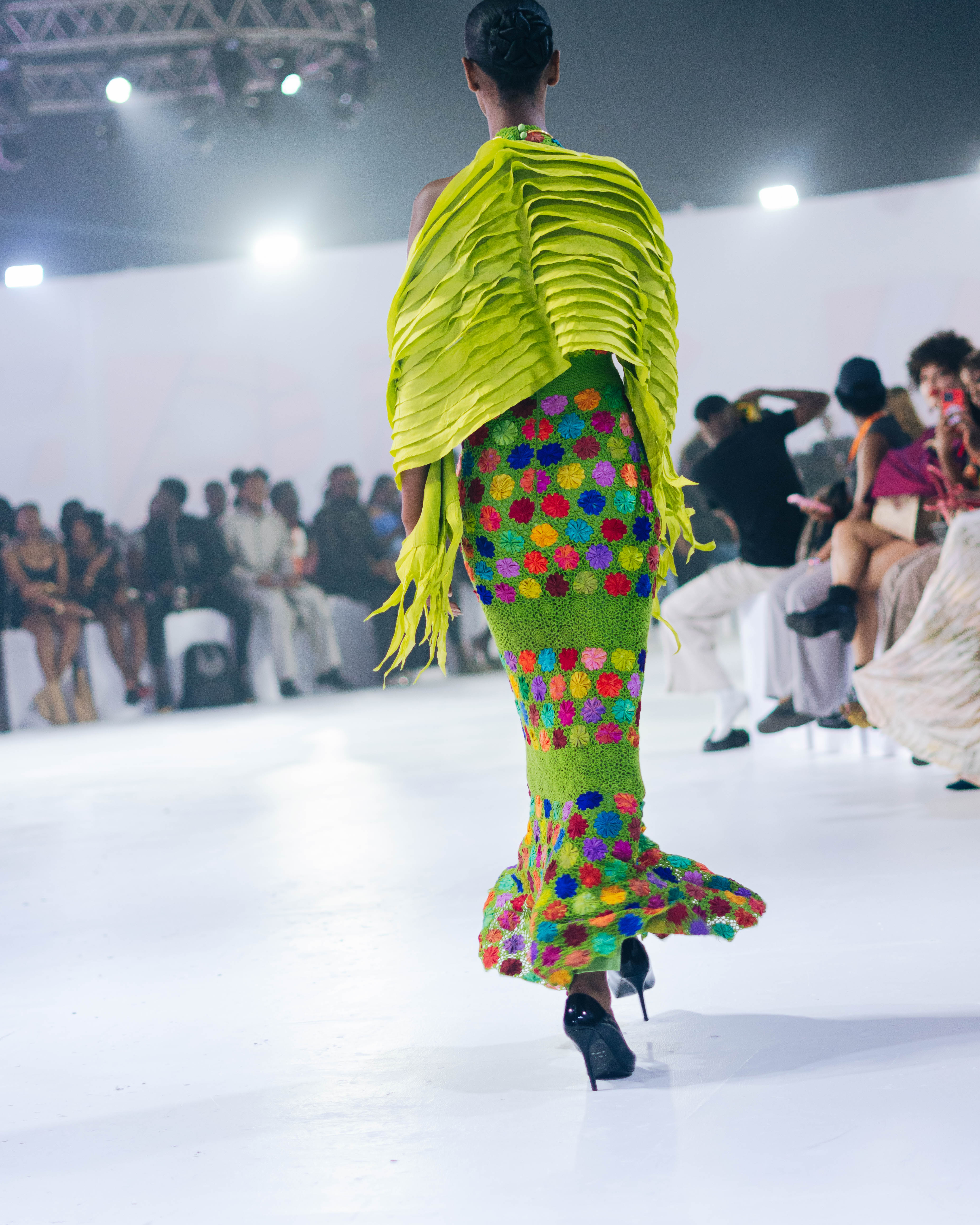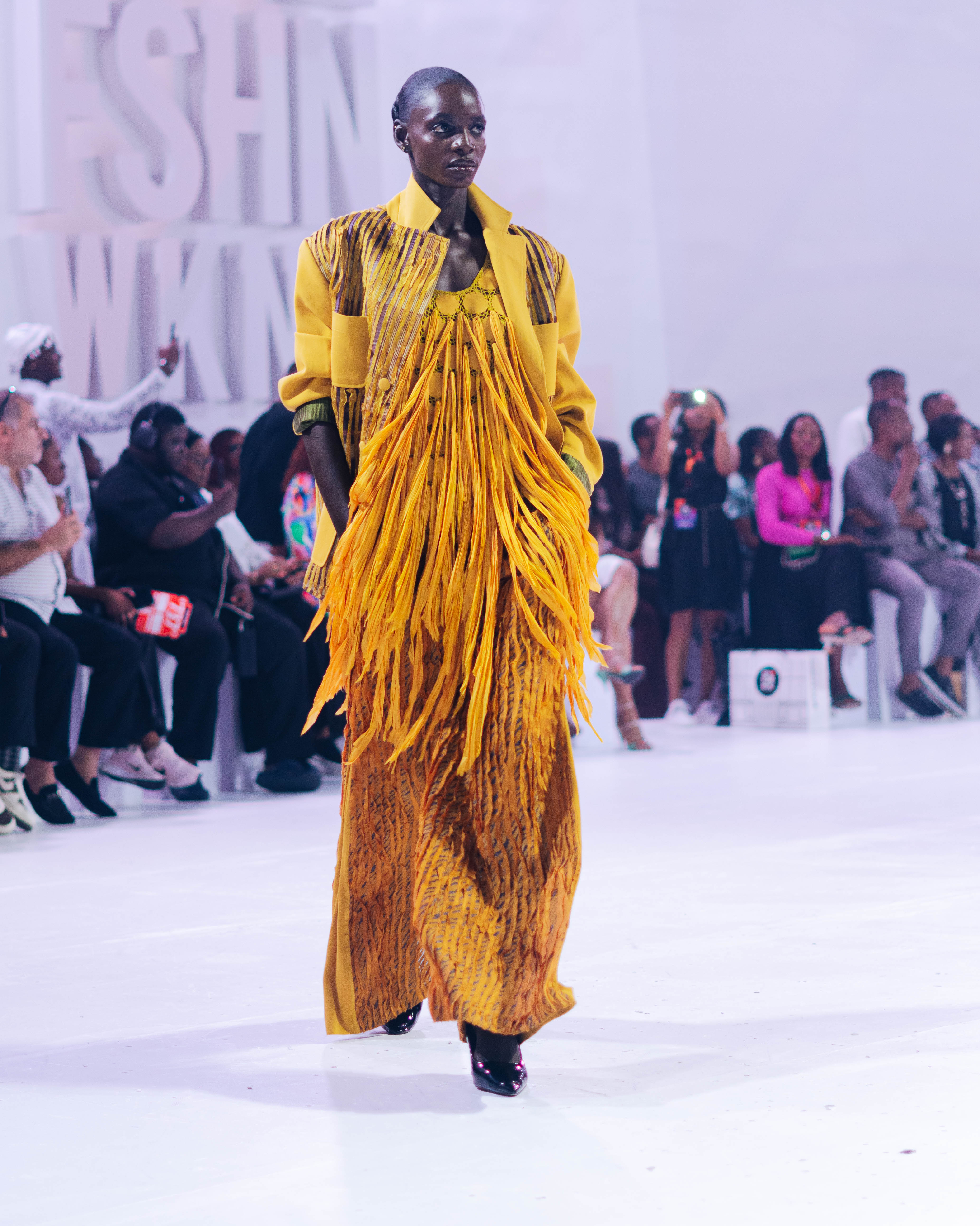 Eric Raisina lit up the Lagos runway with a breathtaking showcase of texture, color, and heritage at the GTCO Fashion Weekend. Renowned for his mastery of raffia and silk, the Malagasy designer wowed with fringed ensembles in vibrant yellows, fiery reds, and lush purples, each piece a celebration of meticulous craftsmanship.