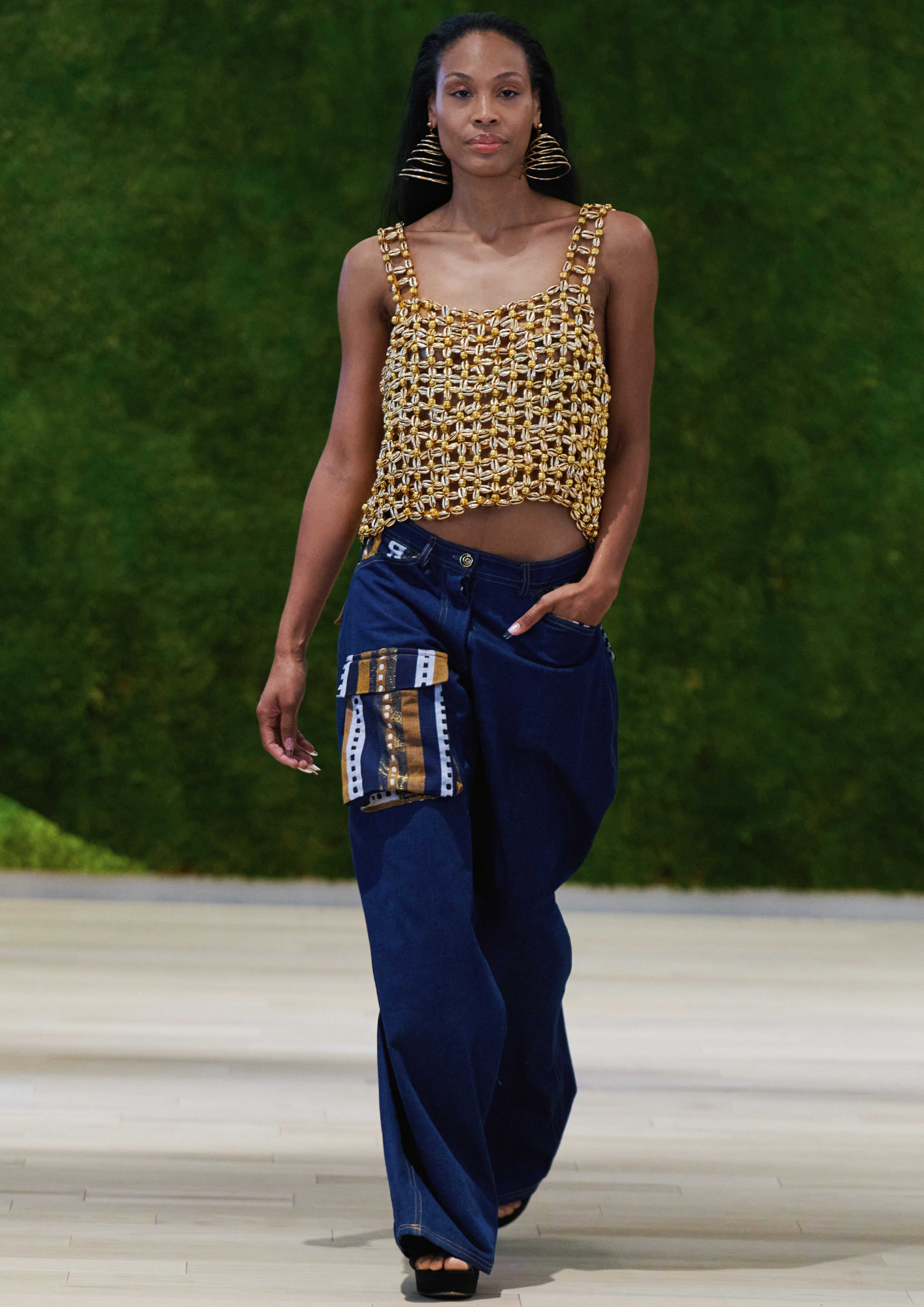 A striking contrast to this was the bold, chain-link crop top, paired with wide-legged, indigo-dyed denim trousers. Here, KÍLÉNTÁR’s creative genius shines through—transforming ancient weaving practices into something utterly modern, yet unmistakably rooted in the past. The piece represented the essence of KÍLÉNTÁR: the ability to bridge worlds, blending history with an avant-garde aesthetic that speaks to today’s global fashion stage.