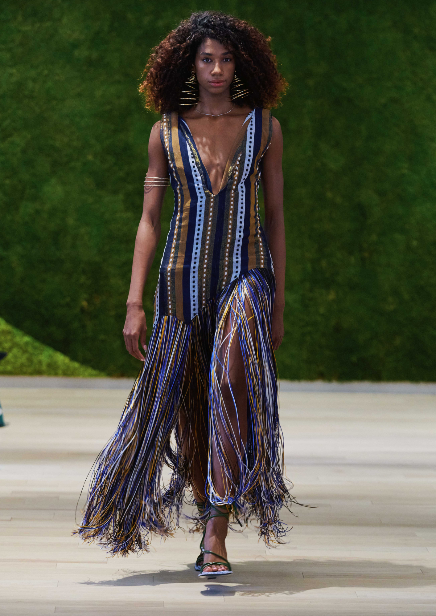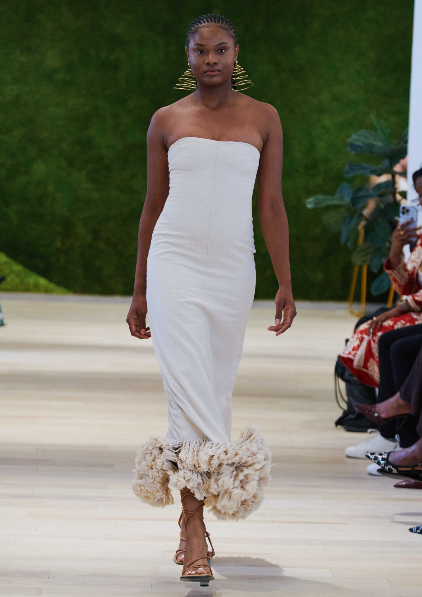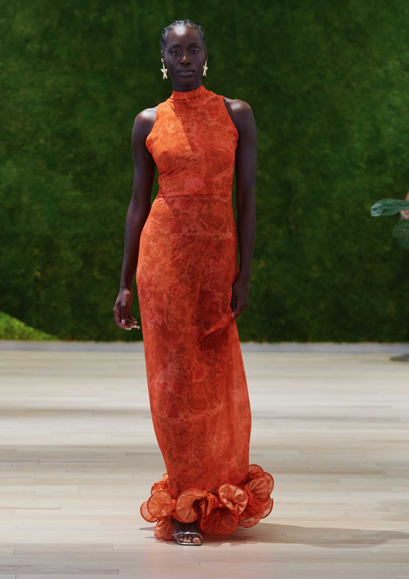 Among the show’s highlights was an ethereal white dress, its sleek silhouette punctuated by luxuriant, textured fringe at the hem, creating an airy, dreamlike movement down the runway. In contrast, a regal burnt-orange gown, with its floor-length elegance, demanded attention with an understated grace. Both looks encapsulated the collection’s ethos—an unwavering reverence for natural fibers and craftsmanship paired with the poise of high fashion.