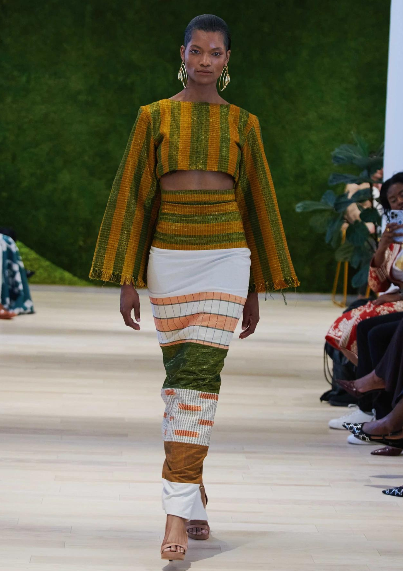 The collection’s standout pieces exuded a deliberate fusion of tradition and contemporary sensibility. One particularly memorable ensemble featured a cropped, striped top in hues of rich green and golden amber, effortlessly paired with a patchwork skirt. The juxtaposition of bold colors and meticulously layered textures evoked the vibrant spirit of African storytelling, where each piece of fabric carries history, culture, and meaning.