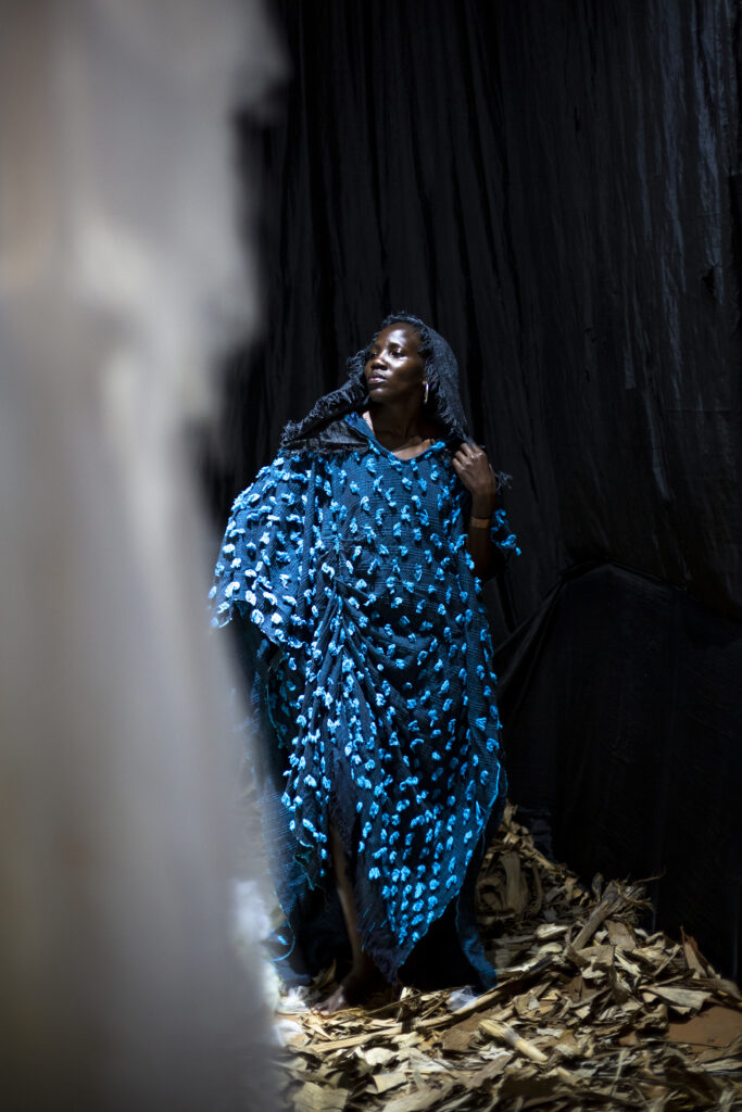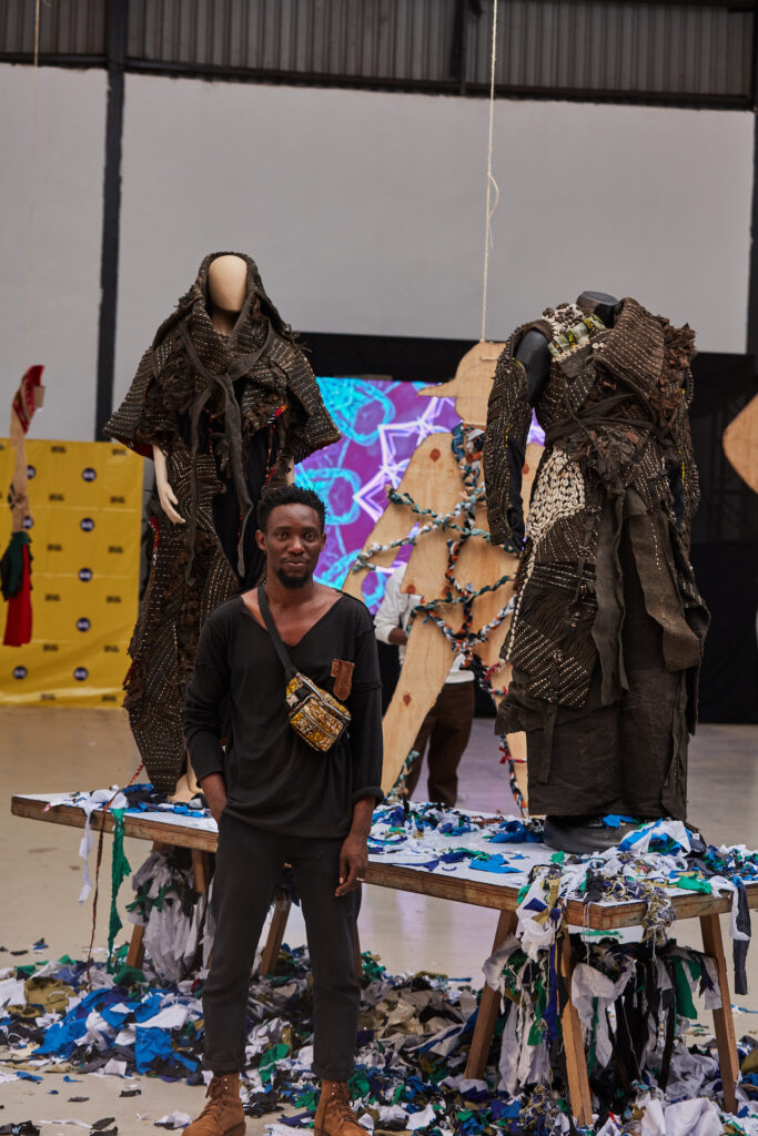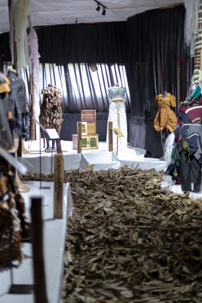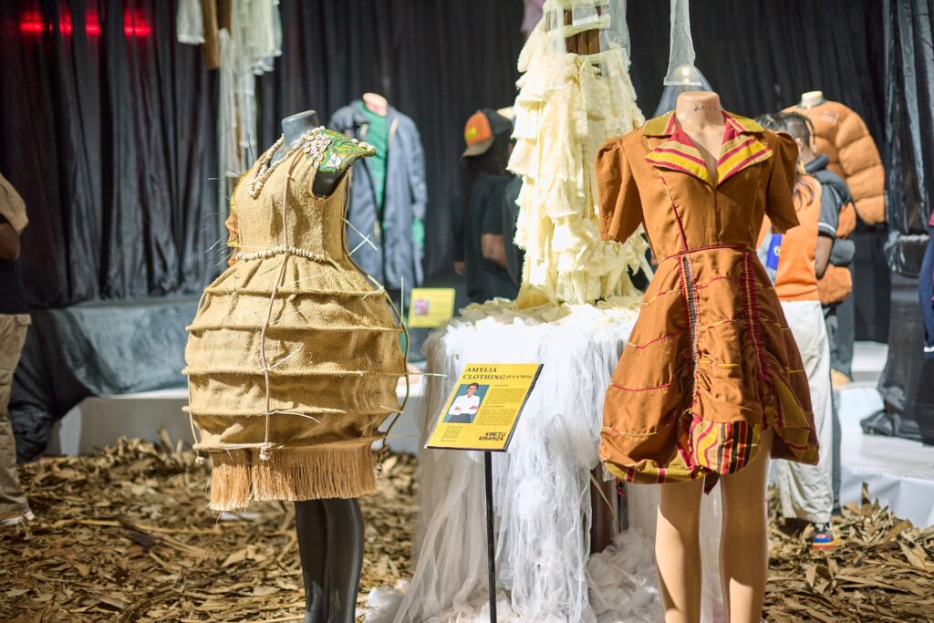 Designers are also working with natural dyeing techniques using sorghum and onion skins. The exhibition space demonstrates this: a temporary village built by members of the semi-nomadic Karamajong community using tree branches, sticks, leaves, cow dung, and straw. Made entirely from natural materials, the structure is both setting and statement.