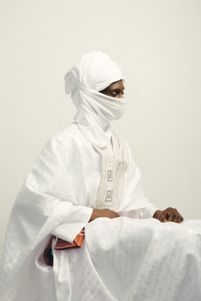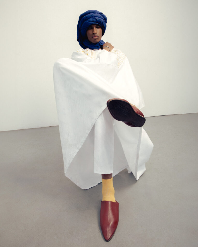 Draped in Malian turbans, he transforms: desert wind and warrior song, Samory Touré’s echo threading through his silhouette. He becomes guardian and raconteur, the editorial’s axis. His stance bridges rebellion and remembrance, extravagance and reverence. The camera does not simply capture him; it converses with him, recording the cadence of his gaze.