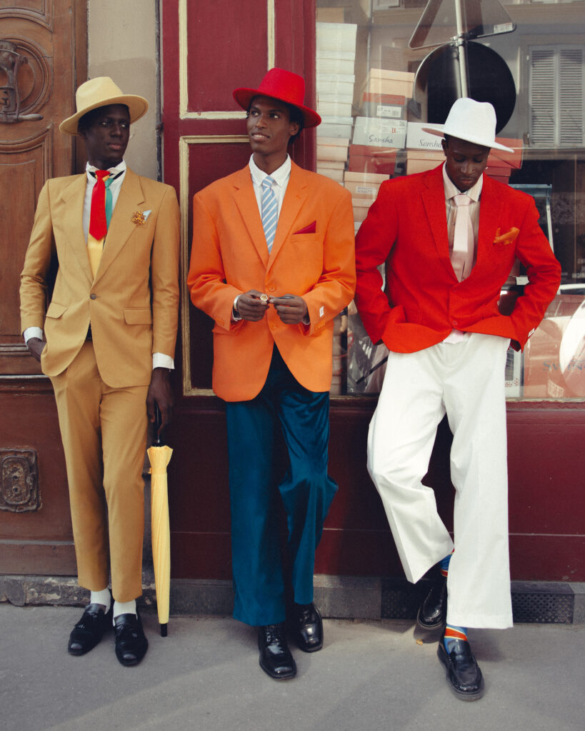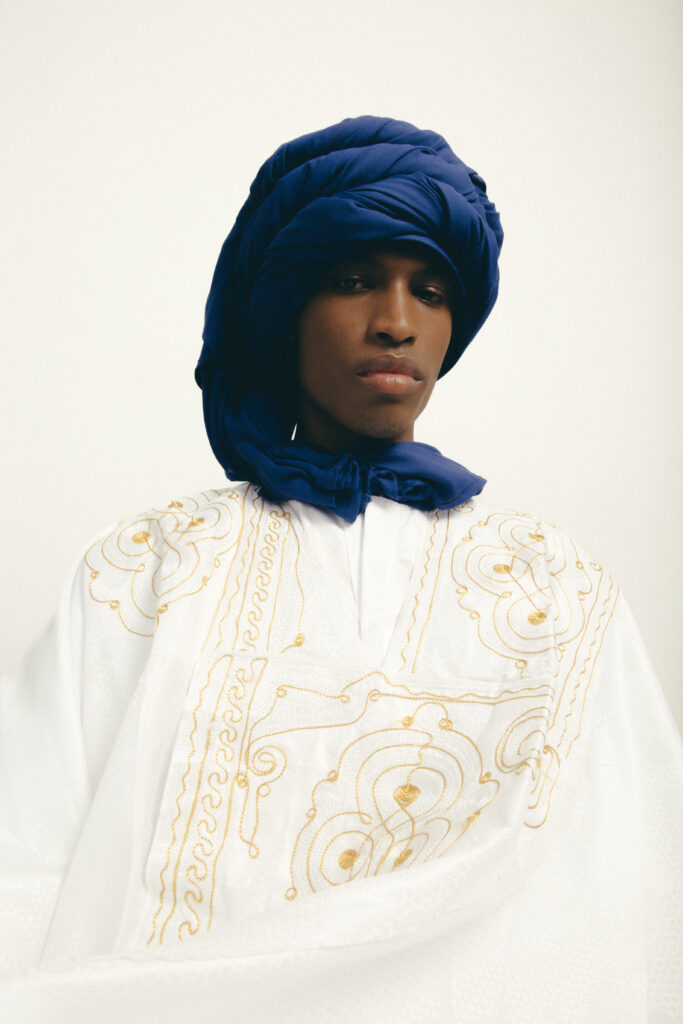 Sakho revisits Jour de Fête boubous, reviving them with intensified color and vibrancy. Headpieces inspired by Samory Touré, Mansa Moussa, and the Tuareg crown the men in historical resonance, while second looks reimagine Congolese dandies — a homage to Papa Wemba, King of La Sape.