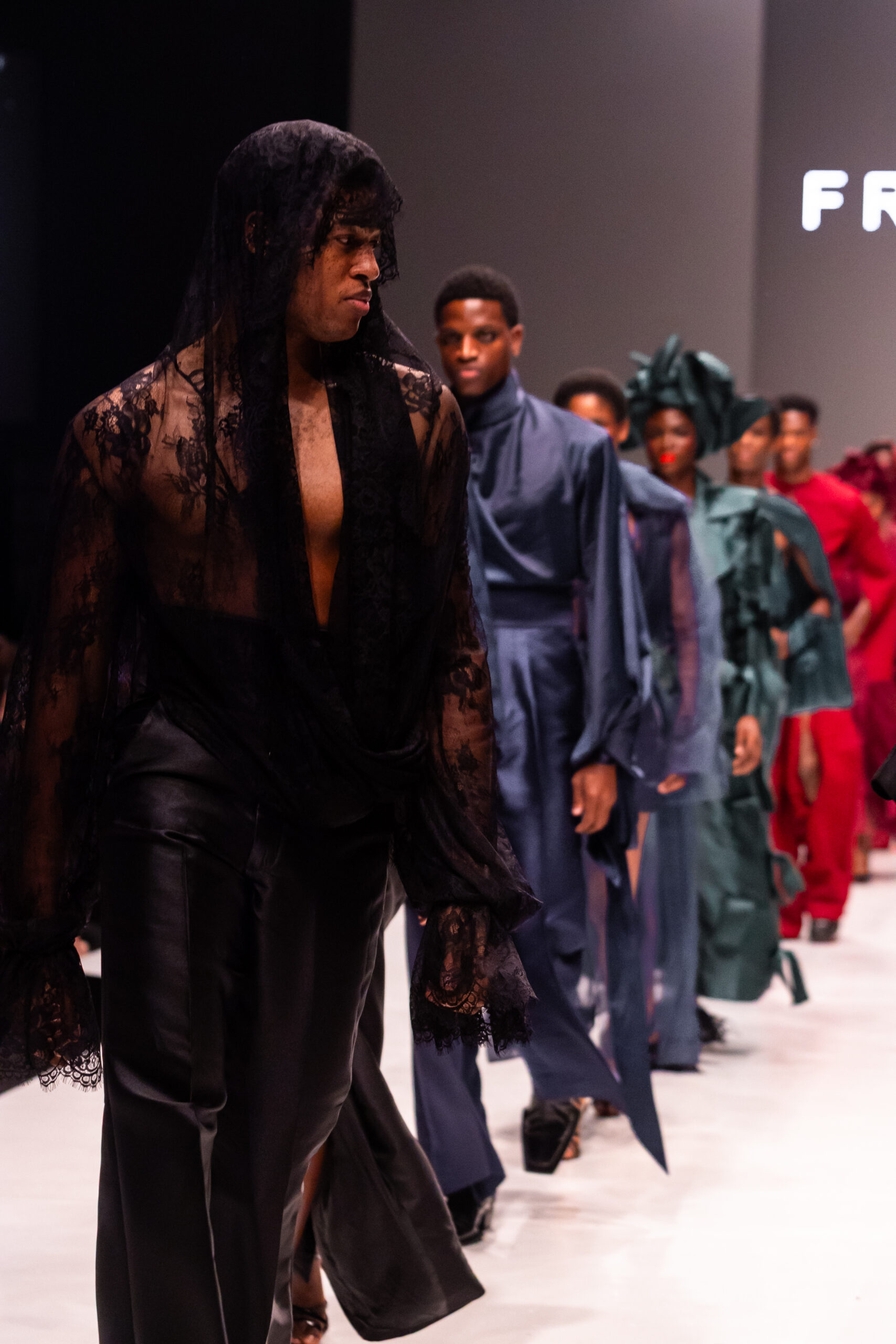 Fruche’s “Nkiruka” collection was a love letter—a son’s ode to his mother, and to the women who pass down strength through beauty. Each look walked like a story of inheritance. Sculptural gowns bloomed in rich reds and metallic tones, shaped to mimic the folds of a headtie. There were voluminous pleats, textured coats, and deconstructed suits with the signature Fruche aesthetic.