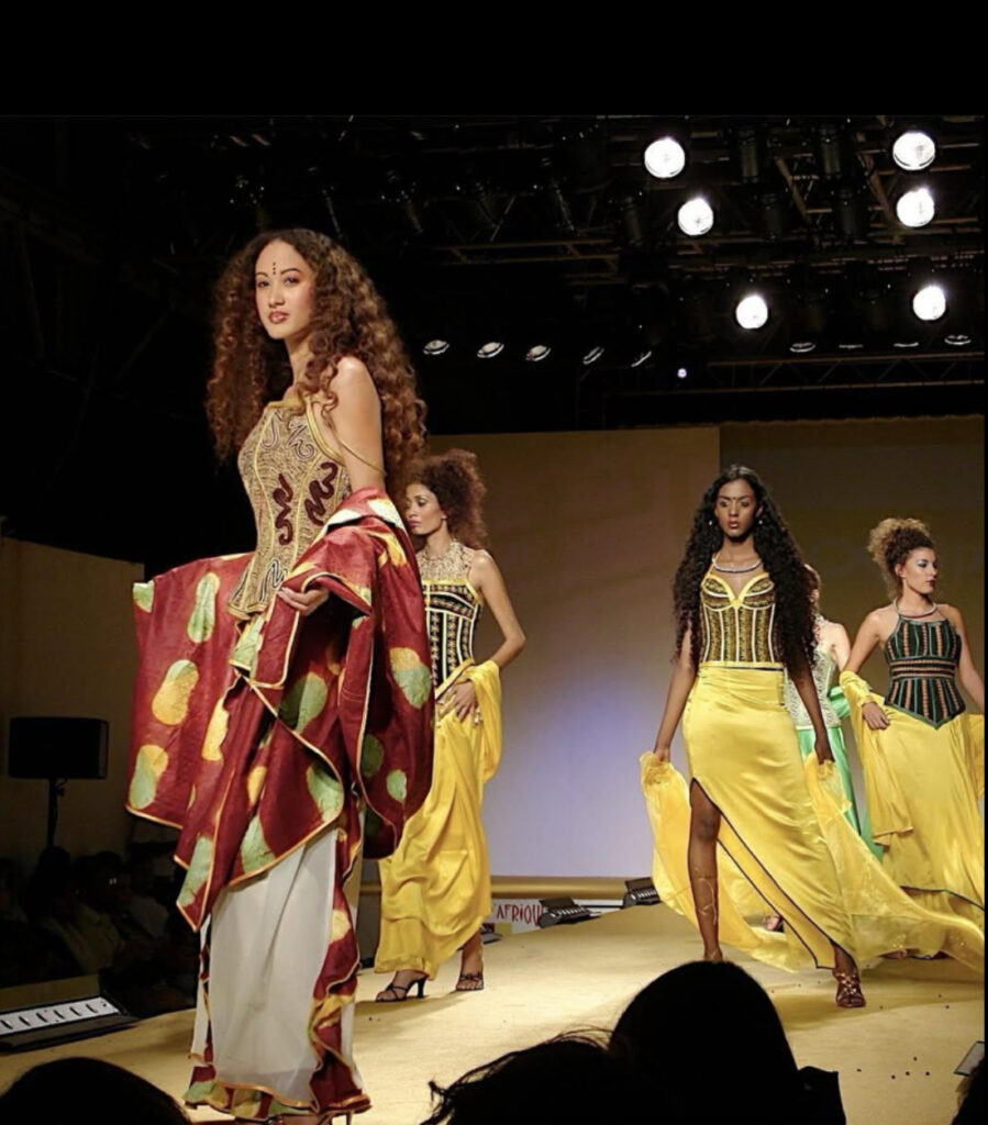 Known as “The Magician of the Desert,” Nigerien designer Sidahmed Seidnaly launched Alphadi in 1984 after training in Paris. His first haute couture collection debuted at the Paris International Tourism Tradeshow in 1985, featuring jewel-toned garments inspired by Saharan nomads. In 1998, he founded FIMA—the Festival International de la Mode Africaine—which brought global designers to Niamey and created opportunities for young African talent. Today, Alphadi balances couture showpieces for international clients with accessible diffusion lines that support local artisans, cementing his role as a founding father of African fashion.
