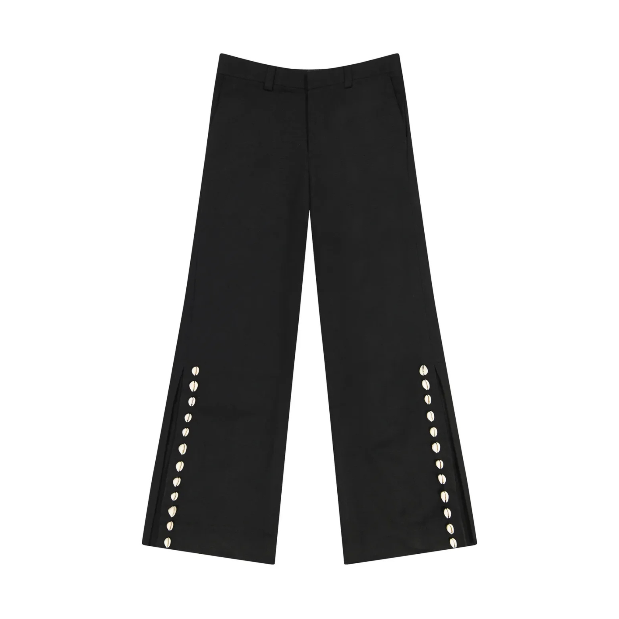 Exquisitely crafted handwoven pants adorned with cowrie shell embellishments along a side pleat, flowing into an elegant flare at the hem. Elevate your look by pairing these trousers with our Kingsley Fugu Vest or Kingsley Fugu Blazer, achieving a sophisticated and harmonious ensemble.