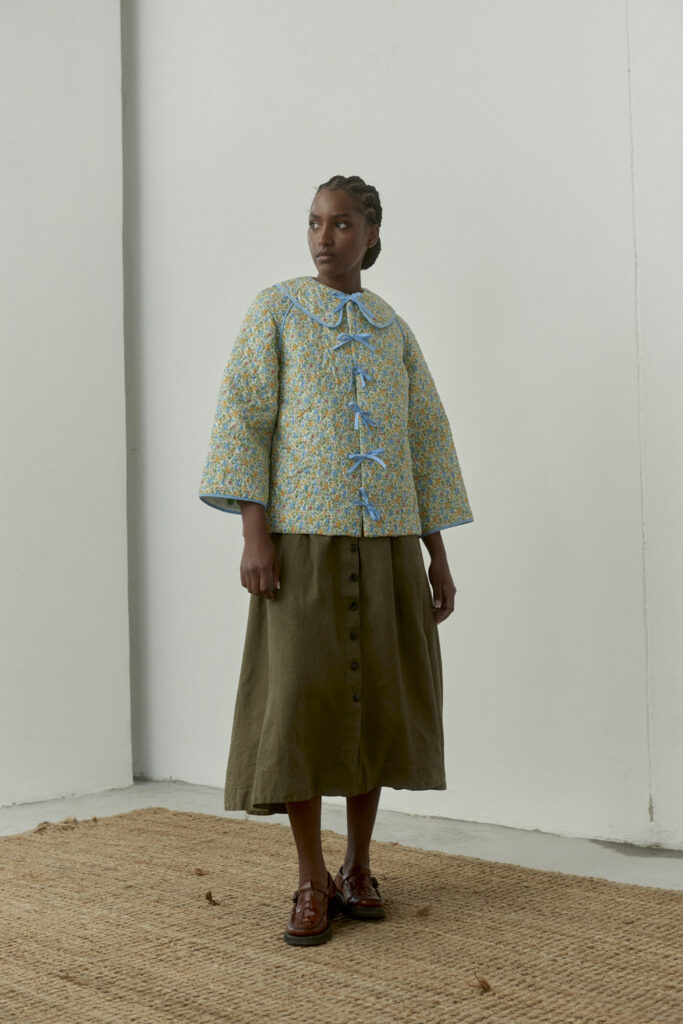 At the heart of the store is In Full Bloom, a collection that honors sisterhood and shared heritage. Inspired by the women in Khumalo’s life, both past and present, the collection unites Cape Town–crafted embroideries with hand-block prints from Jaipur, weaving together South African and Indian traditions. Staying true to her distinctive aesthetic, the prints serve as a vivid homage to color, informed by her travels through India and Morocco last year. The artisans she encountered—deeply rooted in their craft — left an enduring imprint on her creative process.