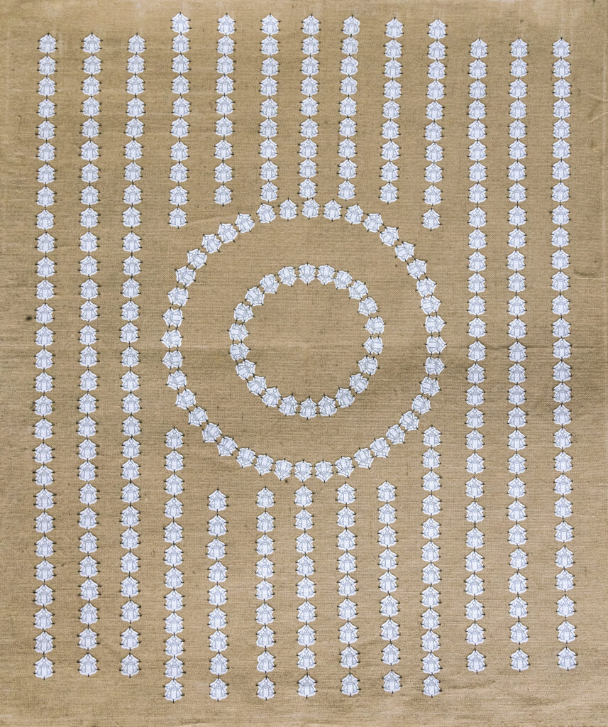 “In my piece, Ala, our Igbo Earth deity, is represented in my embroidered motif. The falling self-portraits represent both a personal and collective descent—a fall from grace and a return to Earth. And despite our moral failures, Ala remains present. She receives us. She takes us back. The cycle continues.”