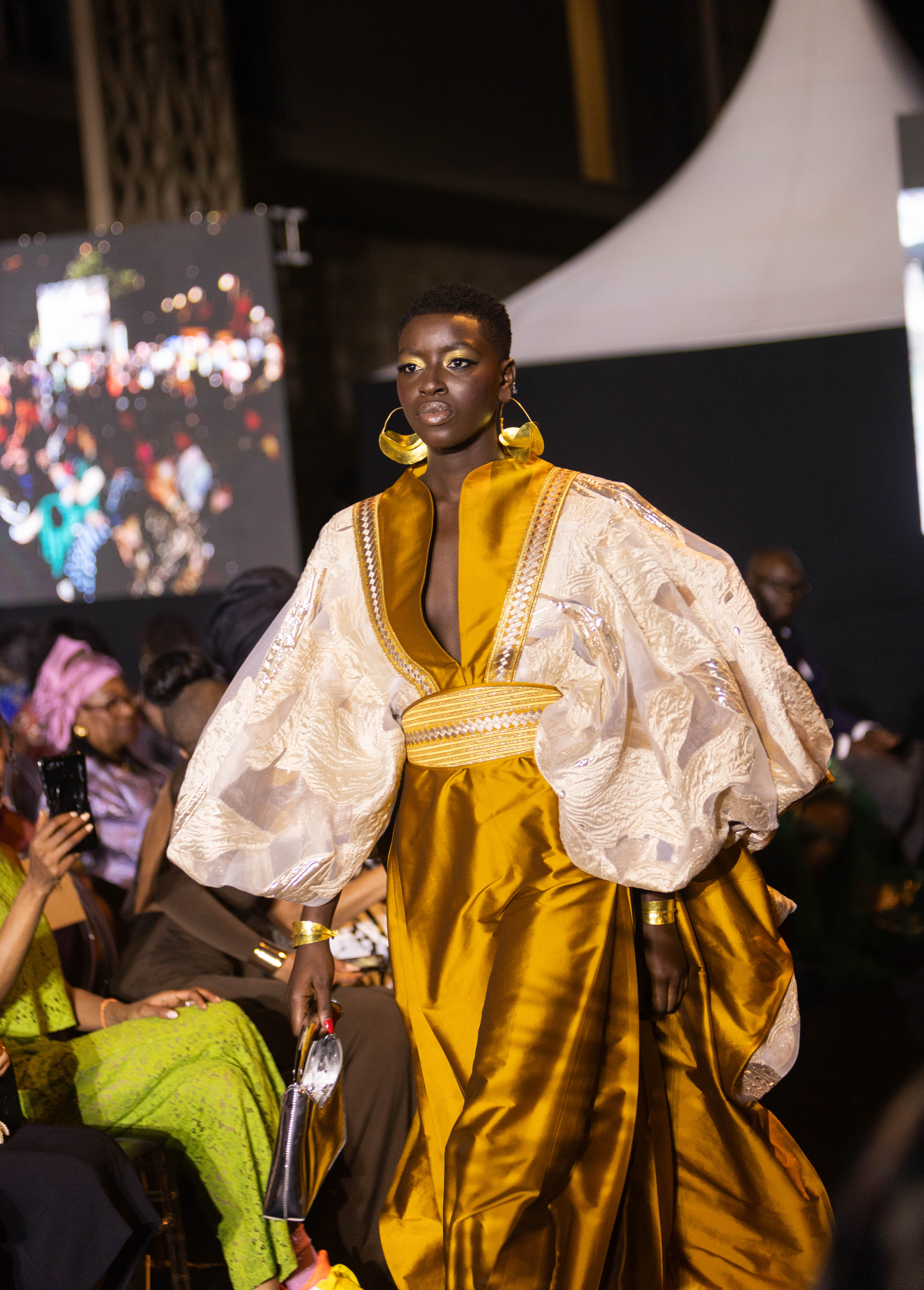 Jeyna A’s collection was a seamless fusion of Senegalese tradition and contemporary style, a tribute to the elegance, strength, and pride of the modern African woman. Raised in Senegal, Jeyna draws deeply from her cultural heritage, crafting designs that celebrate vibrant colors, original cuts, and luxurious fabrics. Her pieces, with their flowing silhouettes and impeccable tailoring, evoke a regal elegance—a perfect balance of modern and traditional aesthetics. The use of brocade fabric, intricate embroidery techniques, and masterful color pairings elevate each design, highlighting the craftsmanship and attention to detail that defines her work.
